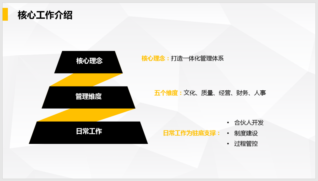 4、合伙人管理部:即將推進(jìn)合伙人風(fēng)控工作組工作,梳理總結(jié),識別分析,從質(zhì)量成果、檔案用印、財(cái)務(wù)管理、稅務(wù)籌劃等方面入手,加強(qiáng)安全合規(guī)管理。