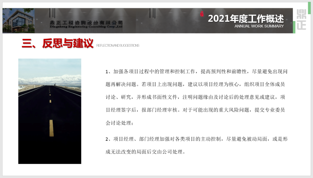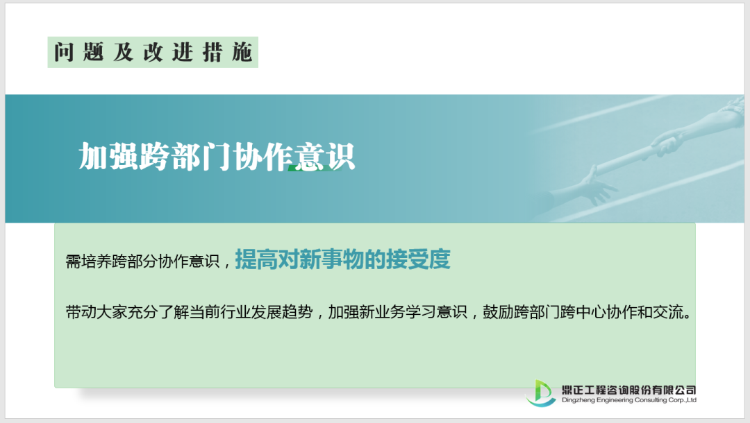 1、工程咨詢事業(yè)部:持續(xù)保持積極向上的態(tài)度,從人才儲備、資質(zhì)資信、技術(shù)沉淀、經(jīng)驗(yàn)積累等方面做了大量工作,為部門“十四五”發(fā)展做了充足的準(zhǔn)備。
