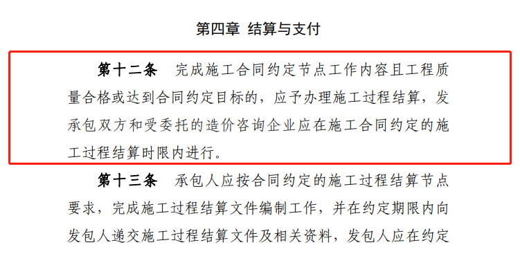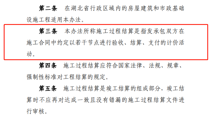 本條定義何為施工過(guò)程結(jié)算,相較住建部2021年發(fā)布的《建筑工程施工發(fā)包與承包計(jì)價(jià)管理辦法》(修訂征求意見(jiàn)稿)第十九條規(guī)定“全面推行施工過(guò)程結(jié)算和支付。發(fā)承包雙方通過(guò)合同約定,按時(shí)間節(jié)點(diǎn)或進(jìn)度節(jié)點(diǎn)對(duì)周期內(nèi)已完成且無(wú)爭(zhēng)議的工程量進(jìn)行價(jià)款計(jì)算、確認(rèn),并按照合同約定比例支付。”《暫行辦法》增加了節(jié)點(diǎn)驗(yàn)收,驗(yàn)收是節(jié)點(diǎn)結(jié)算與支付的前提。
