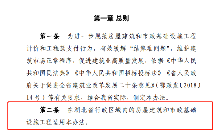 自本辦法實(shí)施之日起,湖北省內(nèi)的房屋建筑和市政基礎(chǔ)設(shè)施工程適用本辦法,不區(qū)分資金性質(zhì)。施工工程是否必須適用本《暫行辦法》,則需結(jié)合項(xiàng)目進(jìn)展情況而定:已進(jìn)行招投標(biāo)或已簽訂合同的工程,仍按原約定執(zhí)行,已發(fā)包暫未確定中標(biāo)單位的,招標(biāo)人可發(fā)布澄清公告對(duì)結(jié)算方式進(jìn)行變更,也可以按原約定繼續(xù)進(jìn)行。