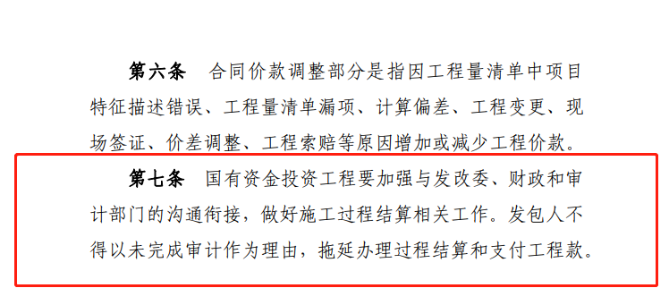 推行過(guò)程結(jié)算,建設(shè)單位應(yīng)滿足施工所需的資金安排,工程驗(yàn)收通過(guò)時(shí)原則上應(yīng)同步完成工程款結(jié)算,不得變相拖延結(jié)算。國(guó)有資金投資工程應(yīng)當(dāng)按照國(guó)家有關(guān)規(guī)定確保資金按時(shí)支付到位,不得以未完成審計(jì)作為延期工程款結(jié)算的理由。在以往的建設(shè)工程司法案例中,合同雙方若在合同中約定以行政審計(jì)后的價(jià)款作為結(jié)算價(jià)款的,法院予以支持。眾所周知,行政審計(jì)一般在項(xiàng)目驗(yàn)收完成之后進(jìn)行,那么在推行施工過(guò)程結(jié)算的背景下,發(fā)包人在招標(biāo)文件及合同條款中再約定以行政審計(jì)后的價(jià)款作為結(jié)算依據(jù)的,明顯與過(guò)程結(jié)算的推行意義相違背。