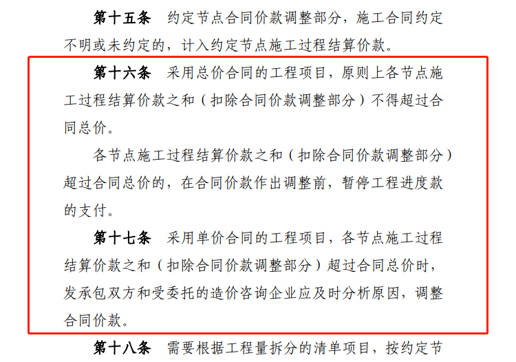 分別對(duì)總價(jià)合同的建設(shè)項(xiàng)目和單價(jià)合同的建設(shè)項(xiàng)目的施工過(guò)程結(jié)算的方式和過(guò)程進(jìn)行解釋、說(shuō)明。總而言之,不管總價(jià)合同還是單價(jià)合同,施工過(guò)程結(jié)算價(jià)款之和(扣除合同價(jià)款調(diào)整部分)均不得超過(guò)合同總價(jià),否則可能出現(xiàn)工程未完成已支付完成的情況。具體支付比例可根據(jù)發(fā)包人資金使用計(jì)劃在合同中約定,但不得低于當(dāng)?shù)匦姓鞴懿块T(mén)的相關(guān)規(guī)定。