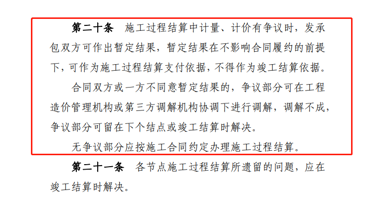 施工過(guò)程結(jié)算中計(jì)量、計(jì)價(jià)有爭(zhēng)議和無(wú)爭(zhēng)議兩種情形。對(duì)于有爭(zhēng)議部分,發(fā)承包雙方可作出暫定結(jié)果,并作為施工過(guò)程結(jié)算支付依據(jù),但不得作為竣工結(jié)算依據(jù),最終竣工結(jié)算按照雙方在調(diào)解后確定,或者在下個(gè)結(jié)點(diǎn)或者竣工結(jié)算時(shí)確定。