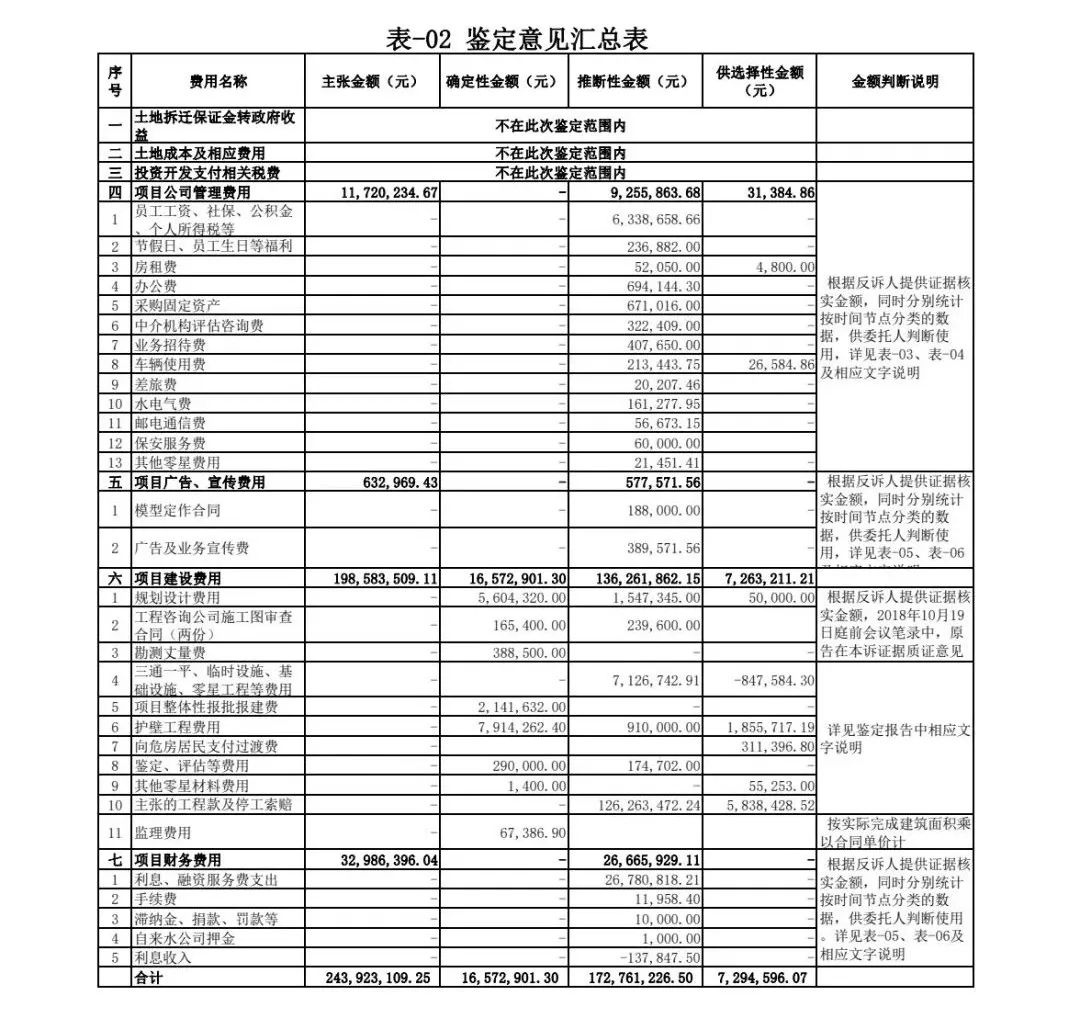 由于本項目涉及費用項目、金額均較大,《鑒定意見書》中分別根據證據情況、國家文件規定、解除合同時間等分類方式,逐項對金額進行了分類,并附加相關說明,為法庭判決提供了數據支撐。最終鑒定確定性金額16,572,901.30元,推斷性金額172,761,226.50 元,供選擇性金額7,294,596.07 元,具體詳表-02
