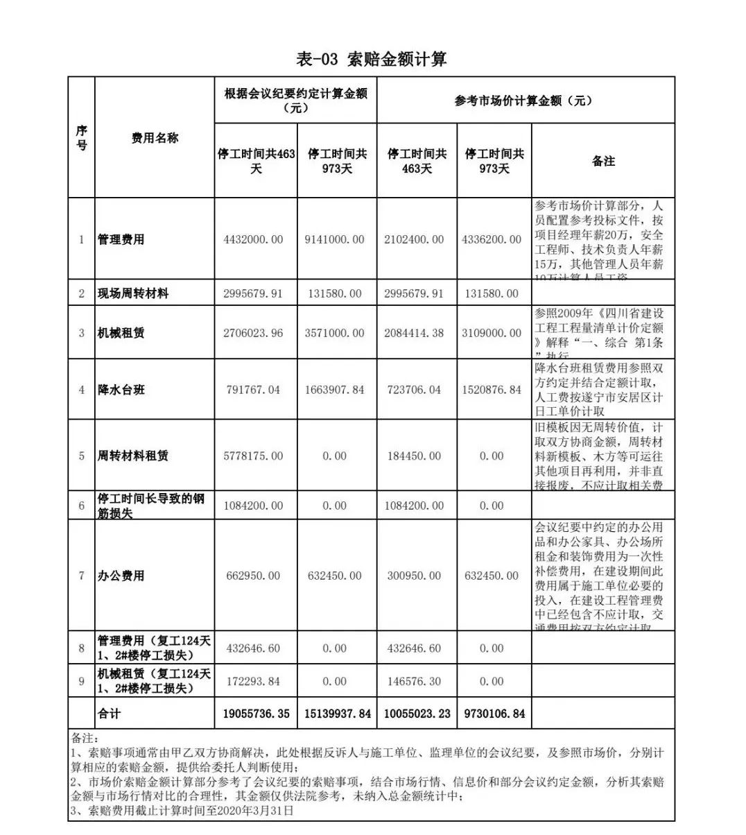政府與開發公司之間的合同已解除,但鑒定時,開發公司與施工單位之間簽訂的施工合同并未解除。項目公司管理費的時間節點判定就成了一個難題。鑒定人經多次內部討論,最終確定:將項目公司管理費列為推斷性金額,且根據不同方案分別統計金額,提交法院參考(具體數據詳表-03):