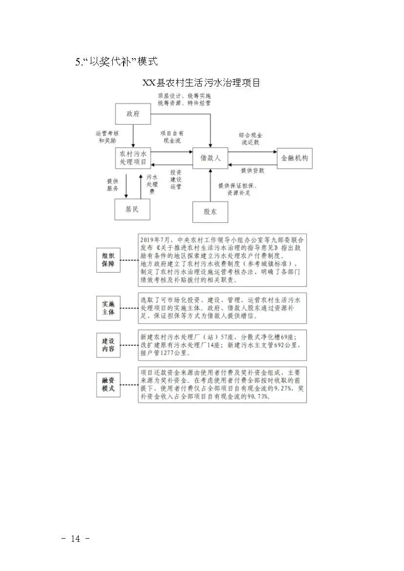 (五)多措并舉,創(chuàng)新模式。地方政府統(tǒng)籌安排,為符合條件的項目爭取多元化的資金,豐富項目資金籌措渠道。鼓勵支持市場化方式運營的項目,包含政府與社會資本合作(PPP)、特許經營,以及環(huán)境綜合治理托管、環(huán)境污染第三方治理、生態(tài)環(huán)境導向的開發(fā)(EOD)等模式。