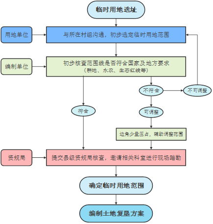 需先確定臨時(shí)用地位置及范圍,經(jīng)自然資源主管部門核查確認(rèn)后,再開展土地復(fù)墾方案編制、臨時(shí)用地報(bào)批等后續(xù)工作,以防止項(xiàng)目開展后出現(xiàn)自然資源主管部門單位審批不通過(guò)或不了解項(xiàng)目情況、臨時(shí)用地范圍不可行等情況,導(dǎo)致項(xiàng)目停滯及反復(fù)溝通等問(wèn)題。
