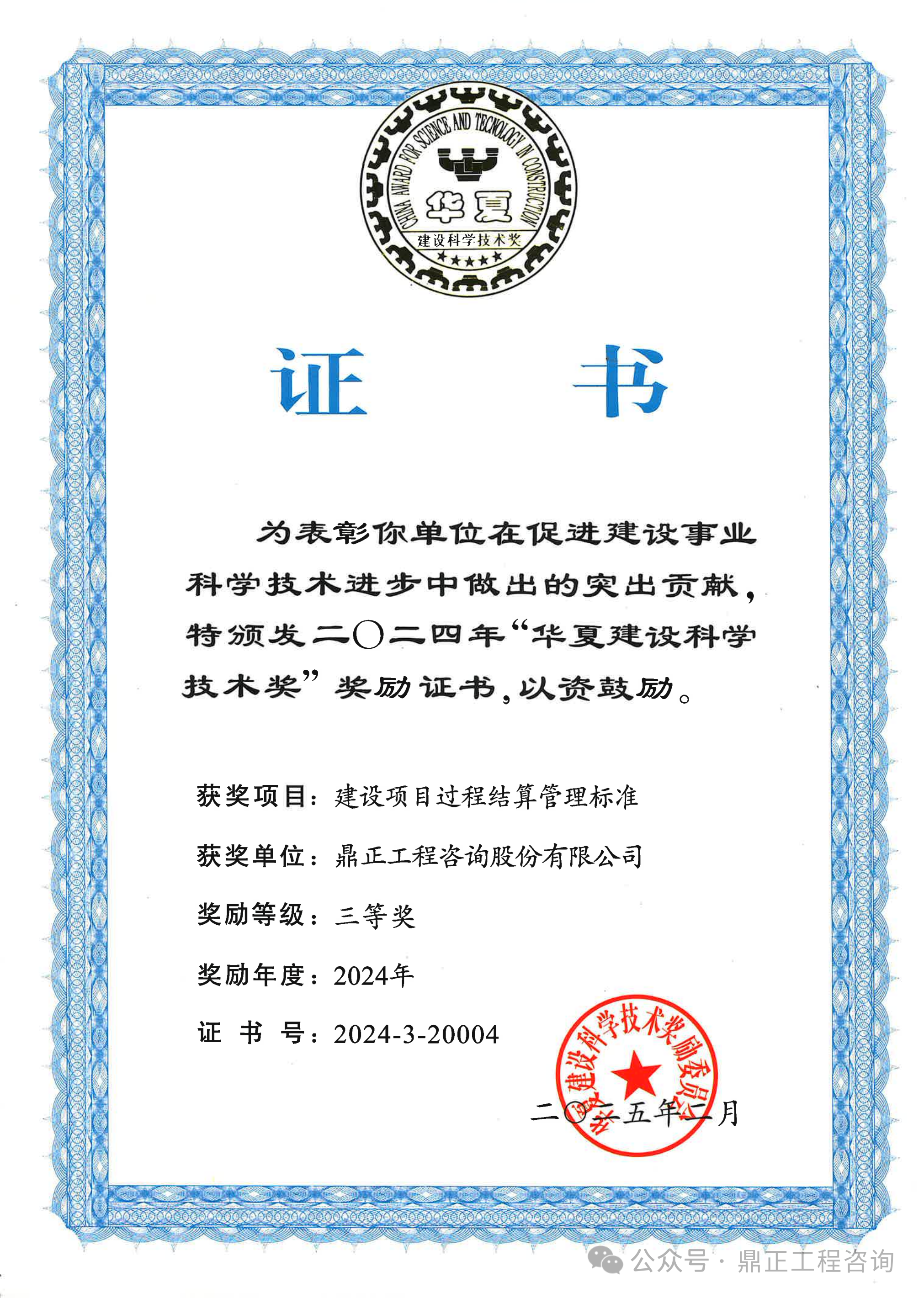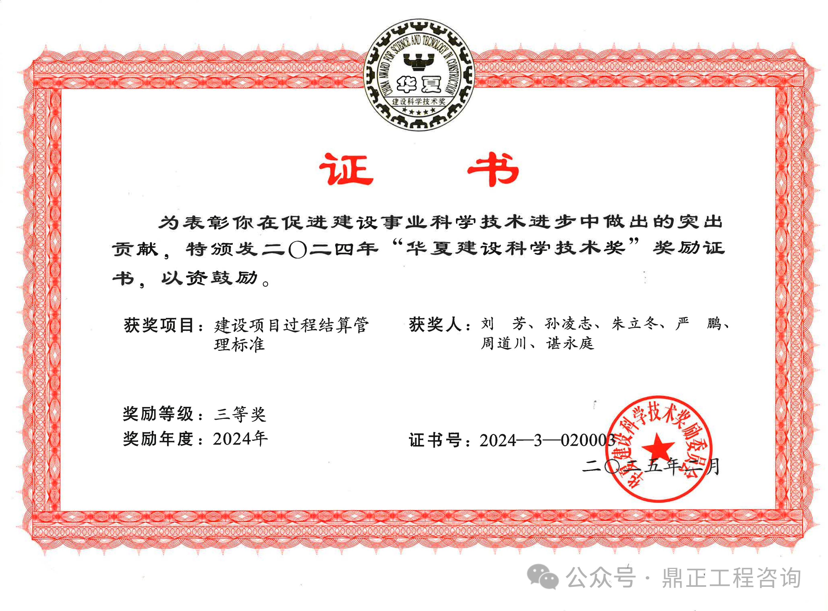 鼎正參與編制的《建設(shè)項目過程結(jié)算管理標(biāo)準(zhǔn)》(T/CECS 1178-2022)通過專業(yè)組和評審委員會的兩級評審,從700余個報送項目中脫穎而出,榮獲2024年度華夏建設(shè)科學(xué)技術(shù)獎三等獎。