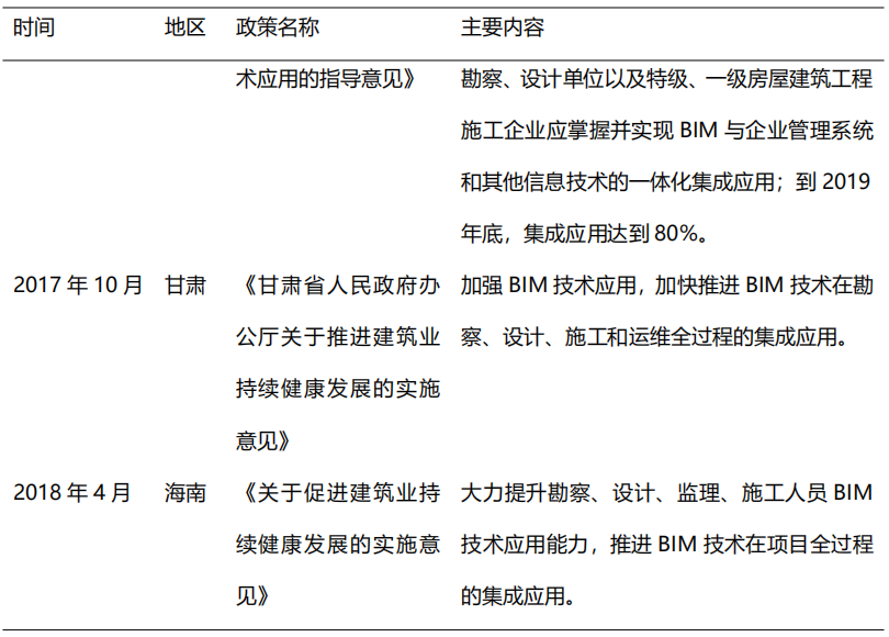 從2014年開(kāi)始,在住建部的大力推動(dòng)下,各省市政策相繼出臺(tái)BIM推廣應(yīng)用文件,到目前我國(guó)已初步形成BIM技術(shù)應(yīng)用標(biāo)準(zhǔn)和政策體系,為BIM的快速發(fā)展奠定了堅(jiān)實(shí)的基礎(chǔ)。2017年,貴州、江西、河南等省市正式出臺(tái)BIM推廣意見(jiàn),明確提出在省級(jí)范圍內(nèi)提出推廣BIM技術(shù)應(yīng)用。2018-2019年,各地政府對(duì)于BIM技術(shù)的重視程度不減,重慶、北京、吉林、深圳等多地政策出臺(tái)指導(dǎo)意見(jiàn),旨在推動(dòng)BIM技術(shù)進(jìn)一步應(yīng)用普及。隨著我國(guó)出臺(tái)BIM推廣意見(jiàn)的省市數(shù)量逐漸增多,全國(guó)BIM技術(shù)應(yīng)用推廣的范圍更加廣泛。表2列舉了部分重要地方鼓勵(lì)政策。