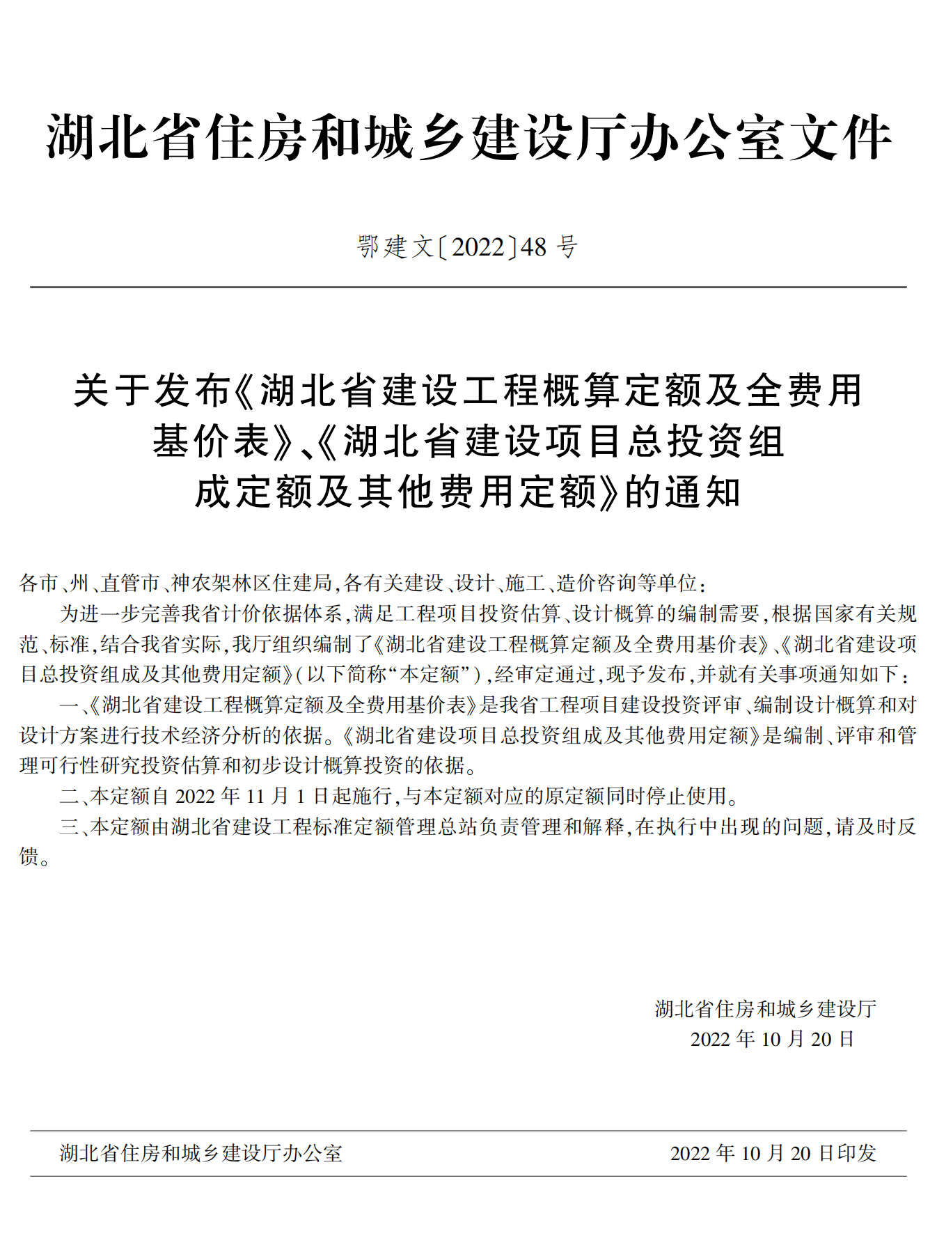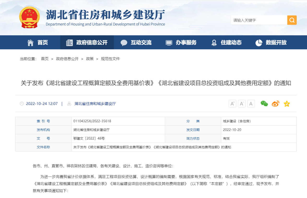湖北省住建廳發(fā)布《湖北省建設(shè)工程概算定額及全費(fèi)用基價表》《湖北省建設(shè)項目總投資組成及其他費(fèi)用定額》的通知