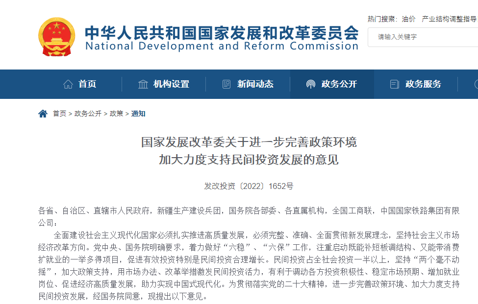 全面建設社會主義現代化國家必須扎實推進高質量發展,必須完整、準確、全面貫徹新發展理念,堅持社會主義市場經濟改革方向。黨中央、國務院明確要求,著力做好“六穩”、“六?!惫ぷ?,注重啟動既能補短板調結構、又能帶消費擴就業的一舉多得項目,促進有效投資特別是民間投資合理增長。民間投資占全社會投資一半以上,堅持“兩個毫不動搖”,加大政策支持,用市場辦法、改革舉措激發民間投資活力,有利于調動各方投資積極性、穩定市場預期、增加就業崗位、促進經濟高質量發展,助力實現中國式現代化。為貫徹落實黨的二十大精神,進一步完善政策環境、加大力度支持民間投資發展,經國務院同意,現提出以下意見。