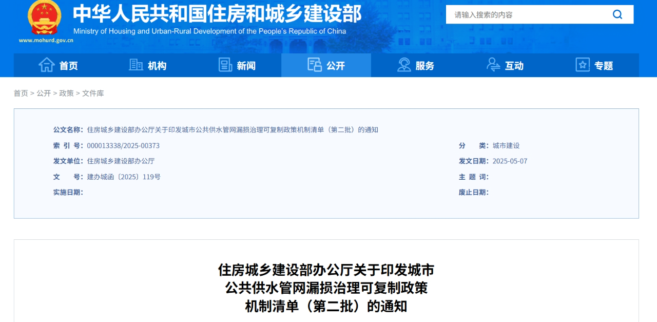為加強城市公共供水管網漏損治理,健全長效機制,近日,住房城鄉建設部、國家發展改革委遴選了50個城市和縣城重點推進,梳理形成了城市公共供水管網漏損治理可復制政策機制清單(第二批)。