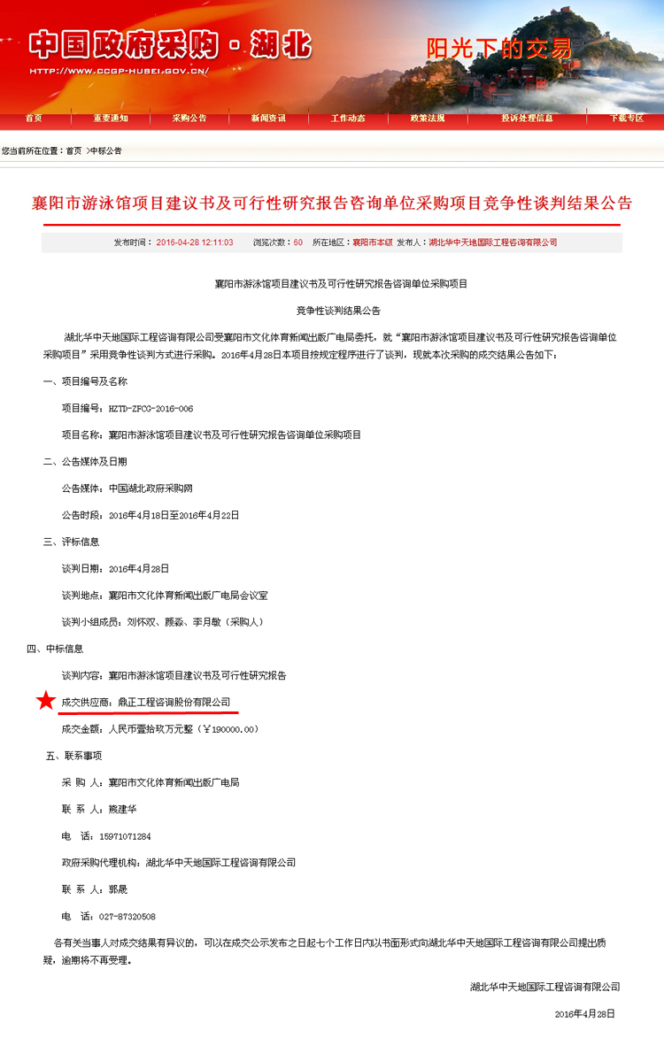 【經營成果】我司中標襄陽市游泳館項目建議書及可行性研究報告咨詢單位采購項目