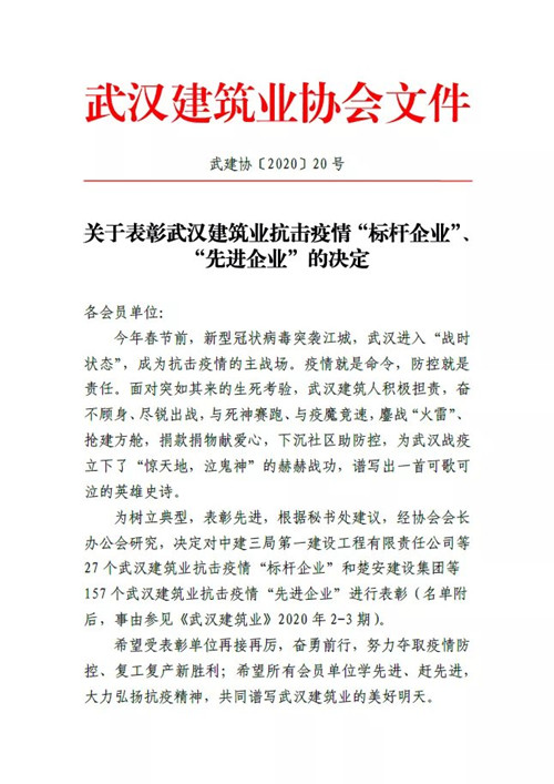 4月14日,武漢建筑業(yè)協(xié)會發(fā)布《武建協(xié)〔2020〕20 號——關于表彰武漢建筑業(yè)抗擊疫情“標桿企業(yè)”、“先進企業(yè)”的決定》,對在抗疫“主戰(zhàn)場”積極擔責,奮不顧身、盡銳出戰(zhàn),與死神賽跑、與疫魔競速的27家武漢建筑業(yè)“標桿企業(yè)”、157家“先進企業(yè)”進行表彰。鼎正咨詢因在武漢抗擊疫情過程中表現(xiàn)突出,獲評“先進企業(yè)”榮譽稱號。