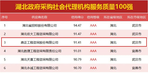鼎正印記丨名列三甲 榮登湖北政府采購(gòu)社會(huì)代理機(jī)構(gòu)服務(wù)質(zhì)量百?gòu)?qiáng)榜